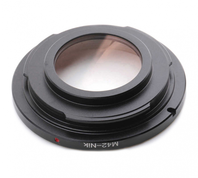 Адаптер M42 - Nikon с оптическим элементом предназначен для установки объективов с резьбой М42х1 (Гелиос, Юпитер, Мир, Индустар, Зенитар) на фотоаппараты системы Nikon. Установленный в переходник оптический элемент компенсирует разницу рабочих отрезков, что даёт возможность фокусировки на бесконечность.