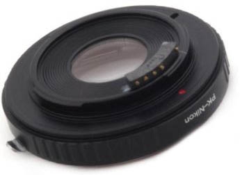 Адаптер Pentax - Nikon с чипом и оптическим элементом предназначен для установки объективов Pentax на фотоаппараты системы Nikon. Данный переходник удобен при использовании объективов с ручным управлением. Установленный в переходник оптический элемент компенсирует разницу рабочих отрезков, что даёт возможность фокусировки на бесконечность. Камера подтверждает точность наводки на резкость (подает звуковой сигнал, высвечивается световая информация на дисплее) при полунажатии на спусковую кнопку и попадании объекта в фокус.