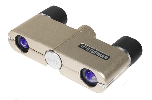 Бинокль Sturman 4x10 выполнен на схеме с Roof призмами, что и обеспечивает ему компактные размеры и отсутствие неудобных изгибов и выступов. Для того, чтобы изображение было ярким и насыщенным, на поверхности всех линз и призм нанесено многослойное просветляющее покрытие. Прочный и лёгкий пластиковый корпус окрашен в элегантный цвет шампань. На корпусе есть петелька для крепления маленького ремешка на запястье, чтобы случайно не выронить бинокль, ремешок входит в комплект поставки. Удобный и такой же компактный бархатный футляр также входит в комплект.