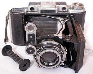 Фотоаппарат Москва-4 – представляет собой советский среднеформатный дальномерный фотоаппарат, выпускавшийся с 1955 по 1958 год Красногорским механическим заводом. Камера имеет складной стальной корпус покрытый дерматином. Объектив камеры выдвигается автоматически после откидывания передней панели с помощью рычажной системы, с корпусом объектив соединяется тканевым мехом. Задняя стенка фотоаппарата открывается на петлях. Автоспуск у данной модели отсутствует, зато имеется синхроконтакт, выдержка – любая. Камера рассчитана на работу с пленкой типа 120 с размером кадра 6×9 или 6×6 см, всего получается 8 кадров. Для работы с размером кадра или 6×6 см в фильмовый канал вставляется специальная рамка, входящая в комплект аппарата. Присутствует также блокировка от двойного экспонирования кадра.