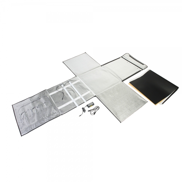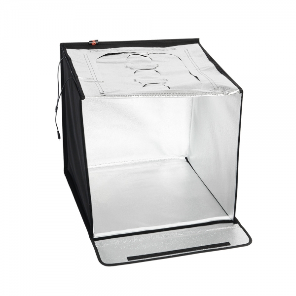 Конструкция разворачивается в квадратный легкий фотобокс и оборудована своим собственным источника света с цветовой температурой 5500К. Внутренние серебристые текстурированные стенки равномерно заполняют куб отраженным светом от двух светодиодных линеек (по 44 светодиода на каждой). Светодиодные линейки установлены на верхней крышке фотобокса, их можно легко переместить вдоль крышки благодаря системе липких лент (велкро). Монтаж конструкции осуществляется также с помощью липких лент, расположенных по периметру стенок. В сложенном виде фотобокс занимает мало места, складывается в кейс с ручкой.