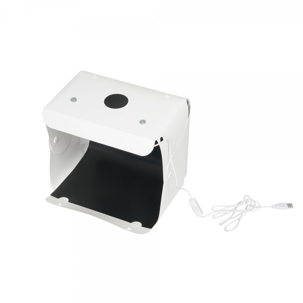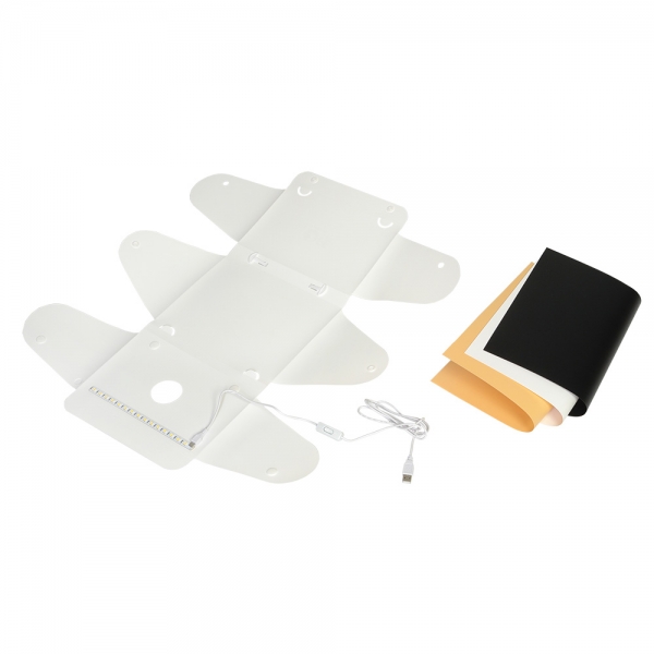 Фотобокс Macro Cube 25 LED является портативной мини-студией и представляет собой белую пластиковую складную конструкцию размером 25x24x22 см и светодиодную ленту на магнитах (15 светодиодов). Фотобокс легко складывается в кейс толщиной 2,5 см, а встроенная ручка делает его удобным для переноски. Перемещая магниты по верхней крышке фотобокса, можно легко отрегулировать положение светодиодной ленты, что позволит выбрать необходимое расположение подсветки без необходимости перемещения объекта съемки. Питание подсветки осуществляется с помощью USB кабеля, подключаемого к зарядному устройству или внешнему аккумулятору PowerBank (зарядное устройство и аккумулятор приобретаются отдельно). В комплект Macro Cube 25 LED входят белый, оранжевый и черный фоны для различных художественных эффектов.