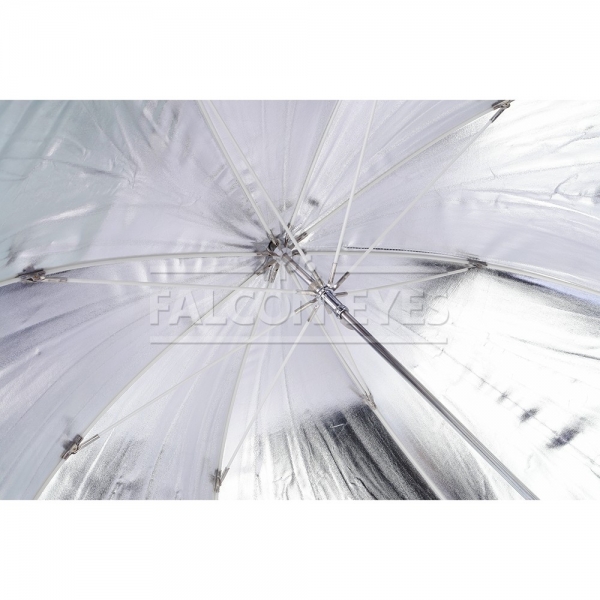 Фотозонт Falcon Eyes URK-60TSB1 Falcon Eyes URK-60TSB1 – комбинированный зонт 2 в 1: просветный/серебристый. Диаметр 122 см. Просветный зонт покрыт белой полупрозрачной тканью. Световой поток от вспышки попадает на ткань зонта, максимально рассеивается и, увеличивая площадь излучения, равномерно освещает объект съемки. Таким образом, резкий точечный свет, излучаемый при срабатывании фотовспышки, преобразуется в достаточно мягкий световой поток, излучаемый с большей площади. Серебристая поверхность зонта дает более жесткий, по сравнению с белыми зонтами, свет, что позволяет получать контрастное изображение с четкими тенями. Два зонта можно использовать совместно для получения более яркого света чем при использовании просвечивающей поверхности, но более мягкого, чем при использовании серебристой. Прочные эластичные спицы из стекловолокна и соединительные элементы из ударопрочного пластика для долговечного использования - спицы не ржавеют, сохраняют форму на протяжении всего срока эксплуатации, устойчивы к механическим воздействиям. Ткань из полиэстера обладает высокой износостойкостью.