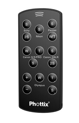Инфракрасный пульт дистанционного управления Phottix 6-в-1 обеспечивает возможность автофокуса и спуска затвора для фотоаппаратов: Nikon, Canon DSLR, Canon G/S/Pro серии, Sony, Pentax и Olympus.