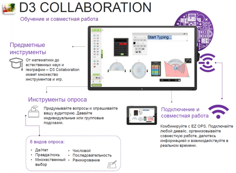 Интерактивная панель D3 G098-100GL 98" cерия G Серия интерактивных панелей G – отличная иллюстрация понятия «универсальность». Устройства этой серии находят свое применение в различных сферах — от офисных конференц-залов до школьных и университетских аудиторий, превращая работу и занятия в увлекательный интерактивный процесс. Это флагманская линейка, совместимая с полным спектром аксессуаров EZ Accessories. Картинка качества 4K и поддержка ОС Windows или Android позволяют проводить презентации и работать совместно. Функции сенсорного экранного меню (On Screen Display, OSD) и 4PIP («Картинка-в-картинке») помогут переключаться между источниками сигнала в любой момент времени на ваше усмотрение. А с поддержкой до 20 одновременных касаний вы сможете взаимодействовать с аудиторией, коллегами и учениками в удобном ключе. В комплекте: EZ Pen, EZ Buttons, D3 Board.
