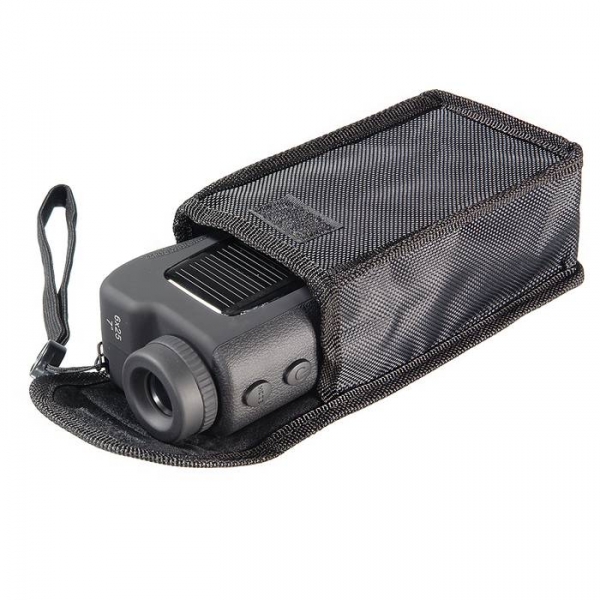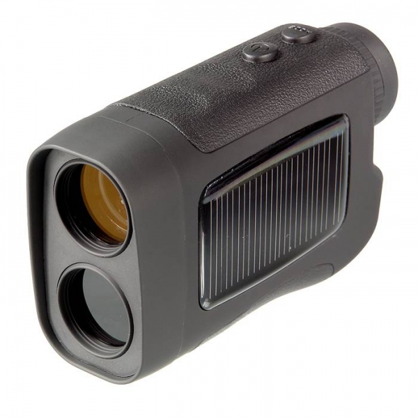 Корпус прибора изготовлен из прочного поликарбоната с нескользящим покрытием soft-touch (придает ощущение "обрезиненности"), с резиновыми вставками сверху и снизу. Влагозащищенное исполнение. Дальномер очень удобно лежит в руке, кнопки управления - под указательный и безымянный пальцы. Кнопка ВКЛ - для включения прибора и проведения измерений (минимальная дистанция - реально 6 метров). Кнопка MODE - изменение режимов работы: 1. Обычный, 2. Дождь, 3. Туман, 4. измерение на расстоянии больше 150 м (для исключения влияния малых объектов - таких как провода, ветки и т.д.). Длительное нажатие изменяет режим измерений с ярдов на метры. Результаты работы и параметры режимов работы, выводятся в поле зрения прибора на ЖК-дисплей. Линии и надписи тонкие и совершенно не мешают наблюдению. Если батарейки нет, а аккумулятор солнечной батареи сел, дальномер можно использовать просто в качестве монокуляра с увеличением 6х (ближняя точка фокусировки - 5 метров). Окуляр с удаленным выходным зрачком, с возможностью диоптрийной подстройки. Выдвигающийся наглазник для удобства наблюдения в обычных или солнцезащитных очках.
