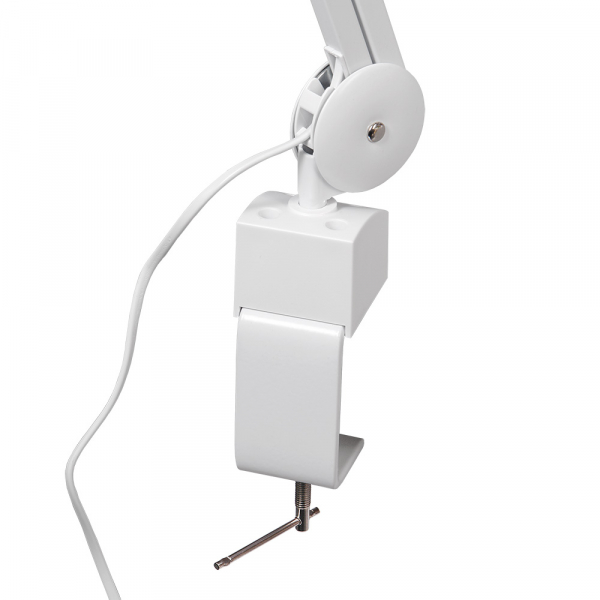 Отличительной особенностью конструкции лупы-лампы Veber 8608D LED Bi-color является использование пантографа с поворотно-наклонным узлом крепления осветителя с линзами. Наиболее часто осветитель с линзами ориентируют параллельно плоскости стола, при этом пантограф позволяет изменять высоту осветителя точно сохраняя эту параллельность. Наличие поворотно-наклонного узла крепления позволяет настроить и зафиксировать положение лупы в любой удобной для наблюдателя плоскости. Это удобно, например, при работе с протяжёнными объектами установленными на столе — реставрации керамических изделий, картин и т. д. При этом, пантограф позволяет сохранять параллельность осветителя с линзами при «сканировании» поверхности этих объектов. Пантограф изготовлен из стального квадратного профиля с полимерным защитным покрытием. Внутри профиля скрыты пружины механизма удержания осветителя на выбранной высоте. Для фиксации на столешнице или любой другой поверхности предназначена стальная струбцина. Максимальная толщина столешницы для установки струбцины составляет 74 мм. Пантограф с осветителем вставляется в отверстие струбцины и может свободно вращаться в ней. Для напольной установки осветителя дополнительно можно приобрести напольный штатив на колёсиках. Чтобы не поцарапать стол, с обратной стороны струбцины предусмотрена резиновая накладка.