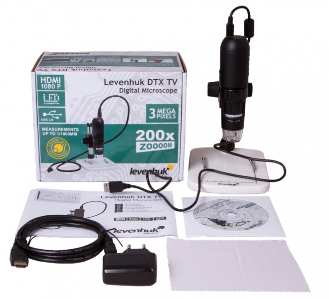 Микроскоп Levenhuk DTX TV – цифровой увеличительный прибор, который может выводить изображение на экран компьютера или телевизор. В комплекте идут USB и HDMI-кабели – вы можете выбрать наиболее удобный для вас вид подключения. В режиме реального времени микроскоп передает картинку с объектива на любой внешний экран. Levenhuk DTX TV – отличный выбор для учебы, хобби и работы. Микроскоп комплектуется штативом. Фиксируя микроскоп на нем, можно получить более четкие изображения. В нижней части штатива расположен предметный столик с металлическими препаратодержателями и измерительной шкалой.