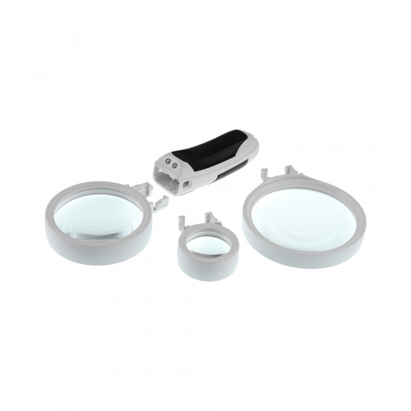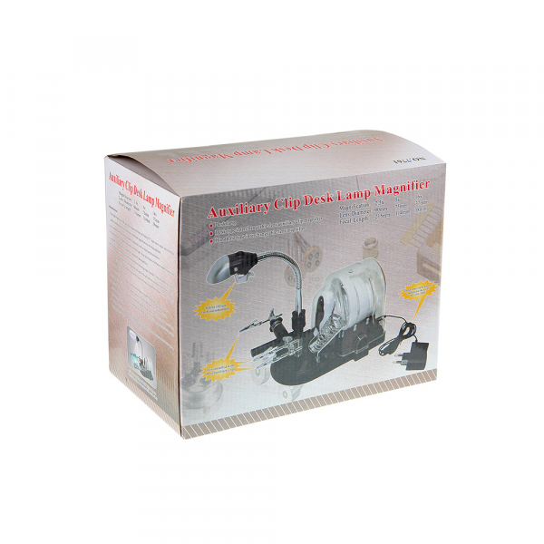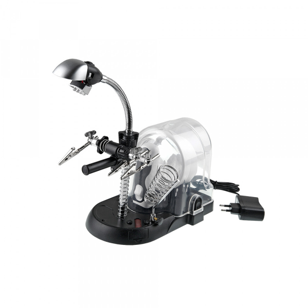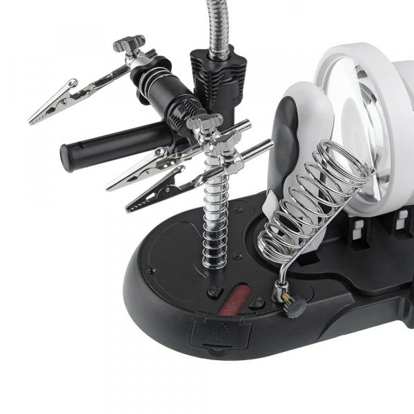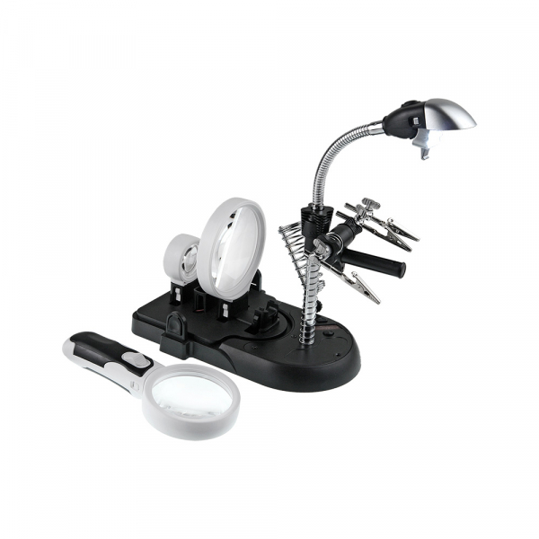 Набор луп с подсветкой Veber S-Clamp 3 с держателем «третья рука» Набор луп с держателем «третья рука» представляет из себя комплект из трёх луп, сменную ручку со светодиодной подсветкой, осветителя на гибкой штанге, кронштейна с тремя «крокодилами», подставки для паяльника. Всё это смонтировано на основании-базе. Каждая лупа может быть закреплена как на гибкой штанге, так и на ручке из комплекта. Питание двух светодиодов ручки осуществляется от трёх батареек ААА (в комплект не входят). Гибкая штанга с плафоном и светодиодами Гибкая штанга (длиной 105 мм) закреплена на металлическом стержне высотой 140 мм. На этом же стержне размещён поворотный кронштейн с «крокодилами», положение которого можно регулировать по высоте. На кронштейне расположена горизонтальная металлическая раздвижная (телескопическая) направляющая, на которой находятся три держателя типа «крокодил» с винтовой фиксацией их положения. Металлическую направляющую можно перемещать взад вперёд по направляющей кронштейна в пределах 54 мм (фиксация положения осуществляется нижней клипсой). Заклон штанги осуществляется ступенчато с винтовой фиксацией положения. На конце гибкой штанге находится регулируемый по наклону блок с шестью яркими светодиодами и гнездо для установки комплектных луп или защитного козырька. Кнопка включения подсветки расположена над блоком светодиодов. Основание-база Основание-база выполнена из АБС-пластика. На верхней передней части базы расположена металлическая накладка с закреплённой на ней держателем паяльника и металлическим стержнем с гибкой штангой. Тут же расположена и подпружиненная площадка с абразивной бумагой для чистки жала паяльника (для смены «наждачки» необходимо открыть защитную крышку с правой стороны базы). На задней части базы расположены держатели для луп, ручки и защитного колпака. Батарейный отсек (на четыре батарейки АА, в комплект не входят) находится на нижней части базы под защитной крышкой. Гнездо адаптера питания (адаптер в комплекте) находится с обратной стороны базы. Купить лупу Veber рекомендуется приобрести для проведения ремонтных работ в микроэлектронике, ювелирном деле, миниатюристам, сборщикам моделей и пр.