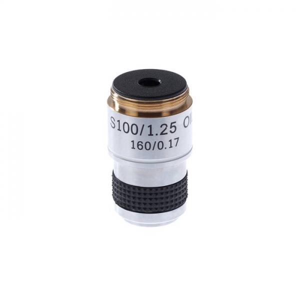 Объектив для микроскопов Микромед С-12, Микромед С-1, Микромед Р-1 с длиной тубуса 160 мм (парфокальная высота h=33мм, стандарт RMS) Увеличение - 100 крат Апертура - 1.25 Масляная иммерсия Ахромат Рассчитан на тубус 160 мм Рассчитан на толщину покровного стекла 0,17 мм Пружинящая оправа