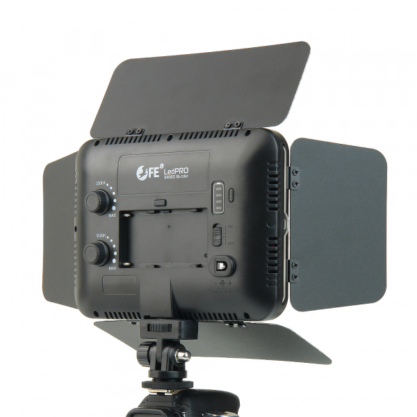 Осветитель светодиодный накамерный Falcon Eyes LedPRO 348BD Bi-color LedPRO 348BD bi-color – компактный накамерный осветитель с излучающей поверхностью 150х100 мм и регулируемой цветовой температурой 3200–5600 К. Яркость свечения желтых и белых светодиодов регулируется раздельно. Плавно изменяя валкодерами мощность двух групп светодиодов можно выбрать сочетание с необходимой цветовой температурой. Съемный полупрозрачный фильтр, закрывающий излучающую поверхность, рассеивает и выравнивает световой поток, смягчает границы теней. Прочные металлические шторки с серебристой фактурной поверхностью отражают свет и позволяют направлять его в нужном направлении. Осветитель может работать от аккумулятора типа NP-F или от сетевого адаптера с выходным напряжением 7,2–8,4 В (аккумулятор и адаптер приобретаются отдельно). Уровень заряда батареи можно контролировать с помощью индикатора и кнопки Test на задней панели прибора. Время работы от аккумулятора NP-F970 – около 1,5 часов. Осветитель устанавливается в горячий башмак камеры с помощью адаптера с винтом 1/4”. Конструкция позволяет отрегулировать угол наклона осветителя и зафиксировать его винтовым зажимом. Гнездо с металлической втулкой на винт 1/4” в основании прибора позволяет устанавливать его не только на фотокамеры, но и на любые опорные конструкции (стойки, штанги, держатели) и использовать как дополнительный источник света, когда невозможно разместить осветитель обычных габаритов.