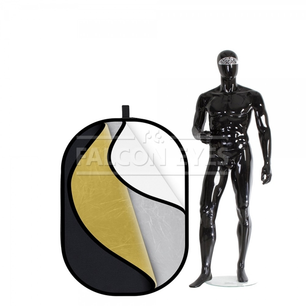 Овальный отражатель 5 в 1: золотистый/серебристый/белый отражающий/ белый просвечивающий/черный. Рабочий размер 90х120 см. Используется в предметной и портретной съемке, а также для подсветки участков кадра. Конструкция состоит из пружинного стального обруча с натянутой на него полупрозрачной рассеивающей тканью и чехла на молнии со светоформирующими поверхностями. Золотистая поверхность придает отраженному свету золотистые тона, добавляет теплого света в сцену. Серебристая поверхность используется для получения жесткого света, что позволяет получать контрастное изображение с четкими тенями. Высокий коэффициент отражения делает эту поверхность одной из часто используемых, найдет применение даже в пасмурную погоду. Белая отражающая поверхность позволяет получить равномерный и мягкий световой поток для подсветки теней и выравнивания светотеневого рисунка, используется как заполняющий источник. Не искажает цветовую температуру источника освещения. Просвечивающая ткань рассеивает проходящий сквозь нее световой поток от вспышки и равномерно освещает объект съемки увеличенной площадью излучения. Таким образом, резкий точечный свет, излучаемый при срабатывании фотовспышки, преобразуется в достаточно мягкий световой поток, излучаемый с большей площади. Черная поверхность поглощает большую часть света, используется для углубления теней и отсекания паразитных засветок, также применяется при съемках поверхностей с бликами. Стальной упругий каркас прошит по периметру капроновым карманом, диаметр отражателя в сложенном виде – 43 см.