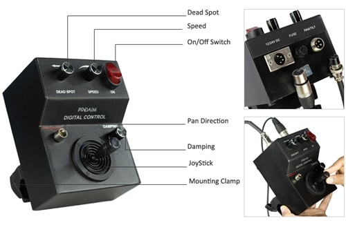 Эта панорамная головка подходит для DV, HDV и вещательной телекамеры массой до 7 кг. Головка мягко и плавно вращает камеру, управляется пультом ДУ. Устройство работает от АС адаптера 12V, с легкостью подключается к аккумулятору 12V при помощи кабеля (входит в комплект, длина 1,2 м) через трехштыревой штекер XLR. Панорамная головка поставляется в комплекте с пультом.