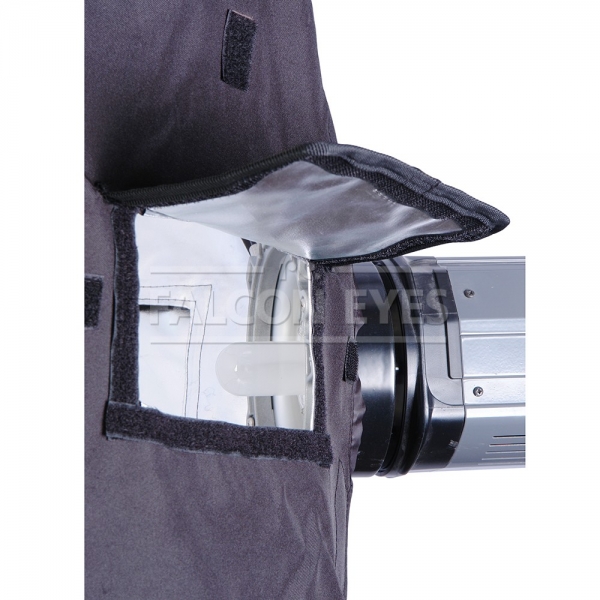 Установленный на приборе софтбокс можно поворачивать на 360 градусов, выбранное положение фиксируется винтом на адаптере. Внешний и внутренний рассеивающие экраны изготовлены из жаропрочных синтетических материалов, крепятся на резинках-растяжках (внутренний) и на липучке (внешний).