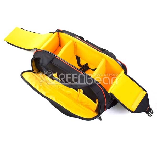 Вместительная сумка предназначена для транспортировки и хранения камкордера среднего размера и дополнительного оборудования. Изготовлена из устойчивого к климатическим воздействиям нейлона с защитным вспененным наполнителем, внутренние стенки из вельвета яркого оранжевого цвета, на фоне которого не затеряются даже самые мелкие предметы. По периметру сумки располагаются ребра жесткости. Двухстворчатая крышка с предохранительным замком для быстрого доступа к камере. Металлические язычки молний снабжены удобными нейлоновыми петлями. Широкая лямка распределяет нагрузку на плече и обеспечивает комфортную эксплуатацию. Удобные ручки со стяжкой. Основной отсек для техники имеет перегородки на липучках, благодаря этому пространство внутри рюкзака можно настроить под оборудование. Внешний боковой отсек с жесткой крышкой позволит разместить необходимые аксессуары.