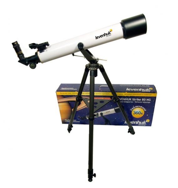 Старшая модель серии Levenhuk Strike 80 NG, которая отличается большими оптическими возможностями. Это рефрактор-ахромат на легкой азимутальной монтировке, который хорошо подойдет для начинающих любителей астрономии любого возраста. Благодаря не имеющей аналогов богатой комплектации, включающей все необходимое для проведения наблюдений, будет отличным подарком для любознательного подростка. В этот телескоп можно рассмотреть множество деталей на лунной поверхности (кратеры и другие детали поверхности крупнее 5 километров), кольца Сатурна, облачные пояса и спутники Юпитера, фазы Венеры, яркие кометы, туманности и галактики, множество двойных и кратных звезд, звездных скоплений и других интересных объектов.
