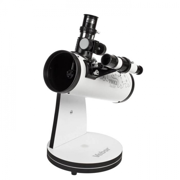 Телескоп Veber Умка 76/300 это классический рефлектор Ньютона на азимутальной монтировке «турельного» типа (Монтировка Добсона). При таких небольших размерах (длина трубы 300 мм, 76 мм диаметр) может показаться, что это детский телескоп, но посмотрите в него- и ваше мнение изменится кардинально. Тем более, что с увеличением 15 крат (окуляр Н20 мм) вы сможете сфокусироваться и днем на любые объекты. Этот телескоп можно использовать и как настольную зрительную трубу. В комплект к телескопу входят два окуляра (8 мм и 20мм) и 2х кратная линза Барлоу, благодаря этому можно менять кратность увеличения простой заменой окуляров. Качественное изготовление монтировки, всех фокусировочных узлов и оптических элементов, позволяет без труда и в деталях рассмотреть многие звезды и объекты солнечной системы.