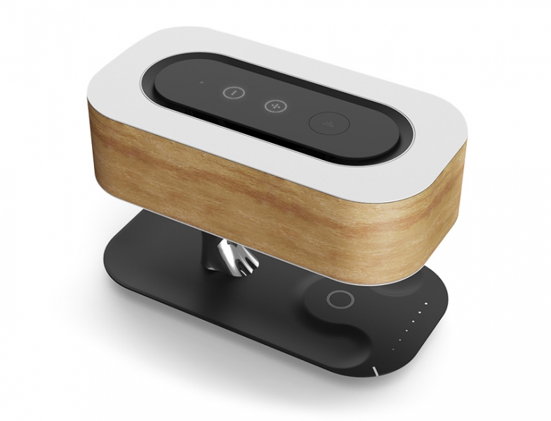 Мощная беспроводная зарядка стандарта QI, с передающей мощностью 5 Ватт, позволяет заряжать смартфоны без снятия пластиковых и силиконовых чехлов толщиной до 0.5 мм. Достаточно положить iPhone или Android-смартфон, поддерживающий стандарт зарядки QI, на поверхность у основания лампы. Встроенный динамик Hi-End класса с парящей мембраной отлично передаёт звучание музыки. За звук отвечает колонка Harman/Kardon, следовательно громкость и качество звука на высоте. Для регулировки громкости и переключения треков доступны сенсорные клавиши в верхней части светильника